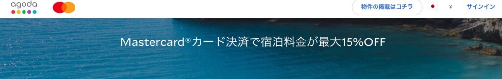 Agodaにはクーポン以外に、クレジットカードのブランドごとの割引キャンペーンがあります。カード割引の中で最も割引率が高いのはMastercard(最大15%OFF)です。
