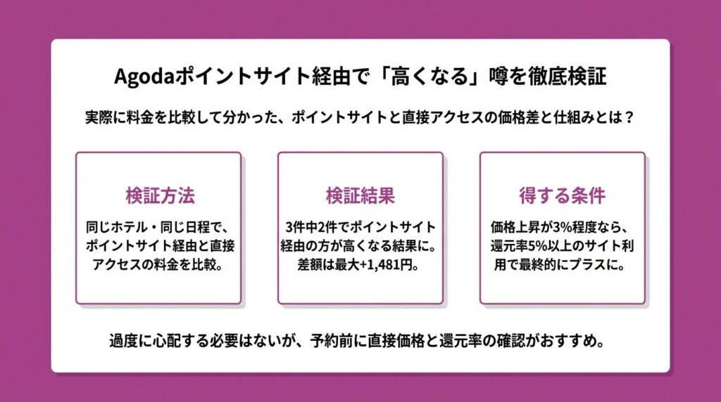 ネット上では「ポイントサイト経由だとAgodaの料金が高くなる」という声もあります。