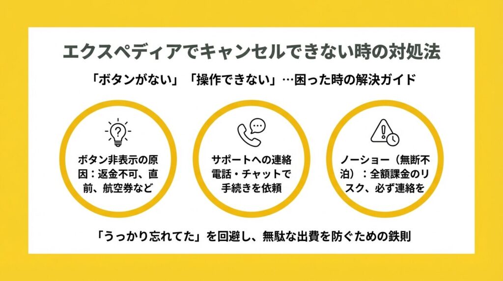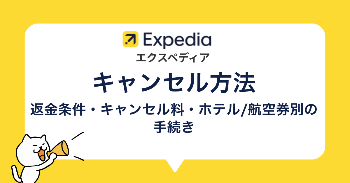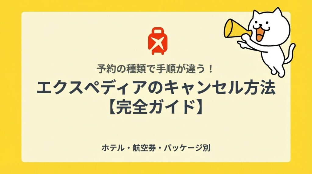 この記事では、エクスペディアのホテル・航空券・パッケージ別のキャンセル手順、無料キャンセル期限の確認方法、キャンセル料の仕組み、返金されない場合の対処法まで、まるっとお伝えします。