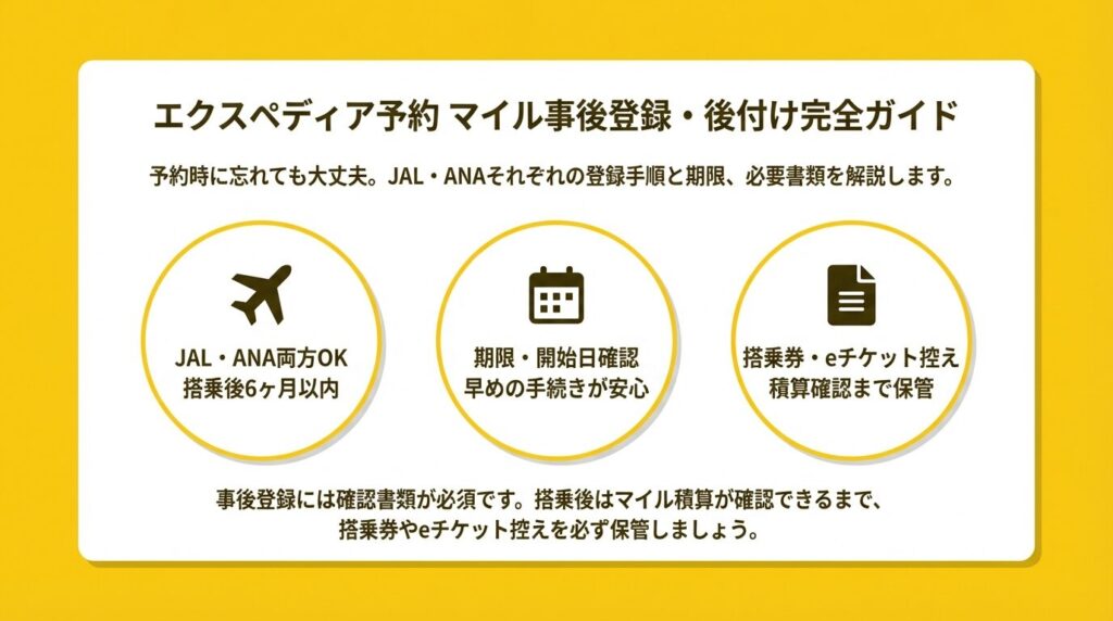 JAL・ANAともに搭乗後6ヶ月以内であれば事後登録が可能です。各航空会社の公式サイトから手続きできます。搭乗券やeチケット控えが必要になるため、搭乗後も保管しておきましょう。