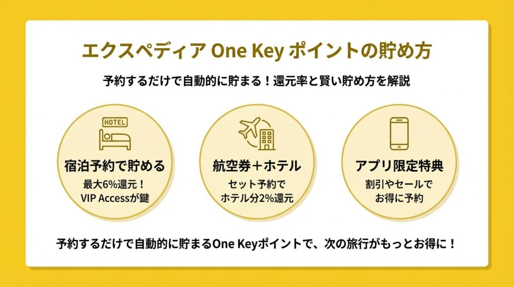 One Keyのポイントは、エクスペディアで予約するだけで自動的に貯まります。還元率は予約する商品カテゴリによって異なります。