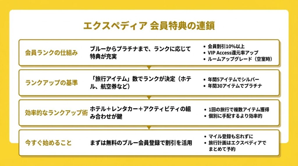 ランクアップを効率よく進めるなら、ホテルだけでなくレンタカーやアクティビティも組み合わせて予約するのがコツです。