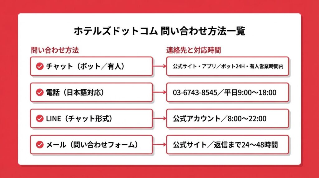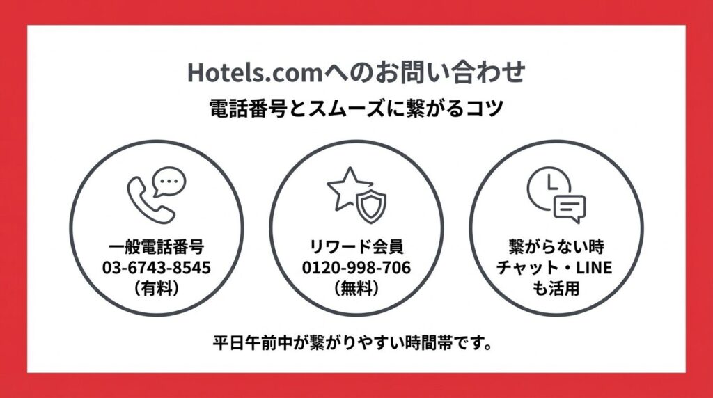 ※電話番号・受付時間・サポート方法は変更される場合があります。最新情報はHotels.com公式ヘルプセンターでご確認ください。