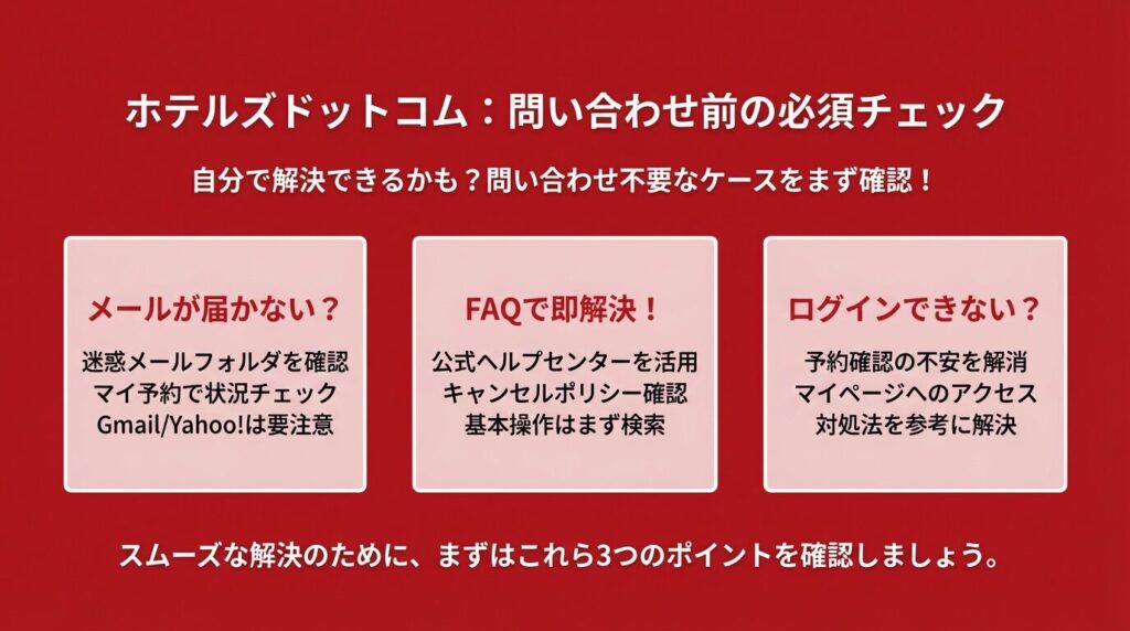 ホテルズドットコムに問い合わせる前に、自分で解決できないかチェックしてみましょう。意外と問い合わせ不要で解決するケースがあります。