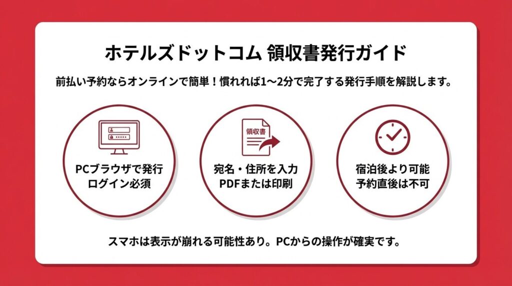 結論から言うと、ホテルズドットコムの領収書は前払い(事前決済)なら予約確認ページから自分で発行でき、現地払いなら宿泊施設で直接受け取ります。宛名は会社名への変更も可能です。