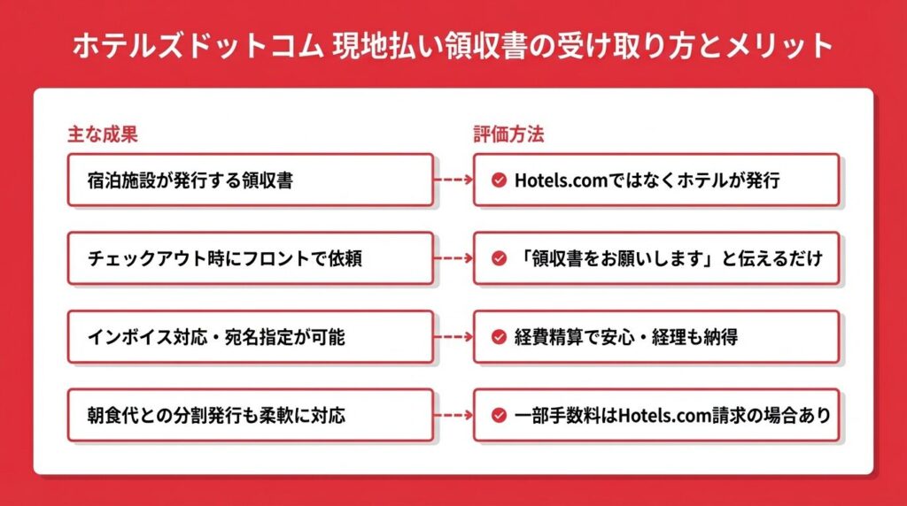 ホテルズドットコムで現地払いを選んだ場合、領収書はHotels.comではなく宿泊施設が発行します。