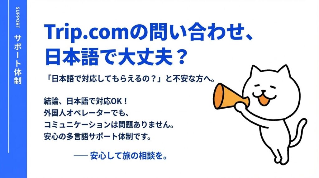 Trip.com公式ヘルプには「日本語のほか、英語や中国語など多言語での対応も可能」と明記されています。日本国内の電話番号(0120-925-780)に電話すれば、日本語で対応してもらえます。