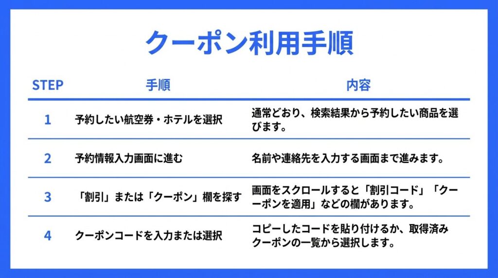Trip.comの初回クーポンは、予約手続きの途中で適用します。使い方はシンプルなので、初めてでも迷わないはずです。