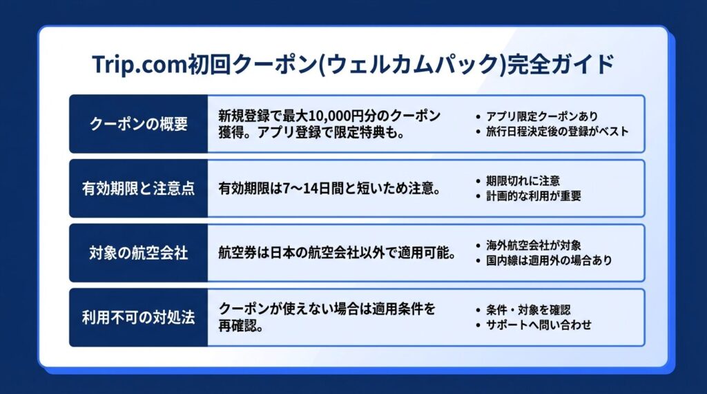 この記事では、Trip.comの初回クーポン(ウェルカムパック)の入手方法から使い方、航空券やホテルに使えるかどうかまで、初めての方でも迷わないように解説します。
