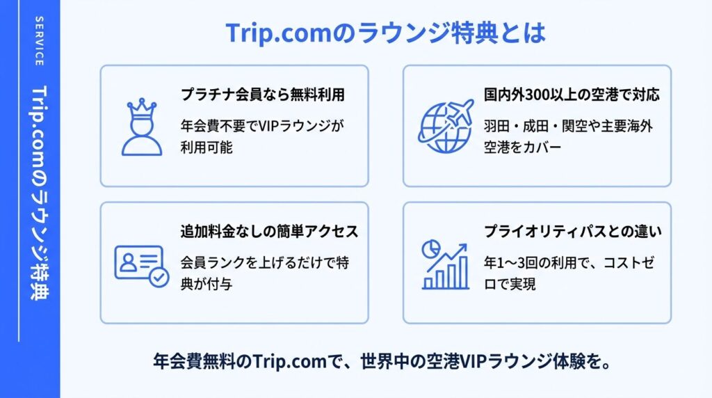 Trip.comのラウンジ特典は、プラチナ以上の会員が空港VIPラウンジを無料で利用できるサービスです。