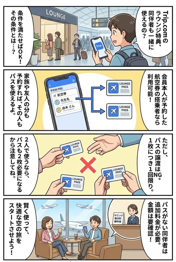 Trip.comのラウンジ特典は、条件を満たせば同伴者も一緒に利用できます。