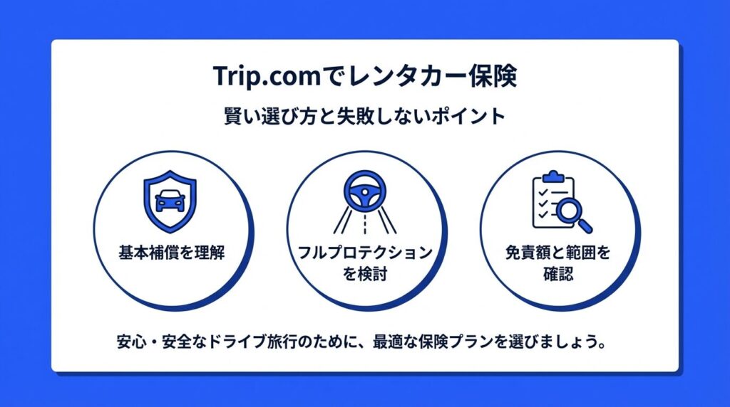 Trip.comでは、車両損害補償・盗難補償・対人対物補償などをカスタマイズできます。予約時に付帯する基本補償の内容を確認したうえで、必要に応じて追加保険を選ぶ流れです。