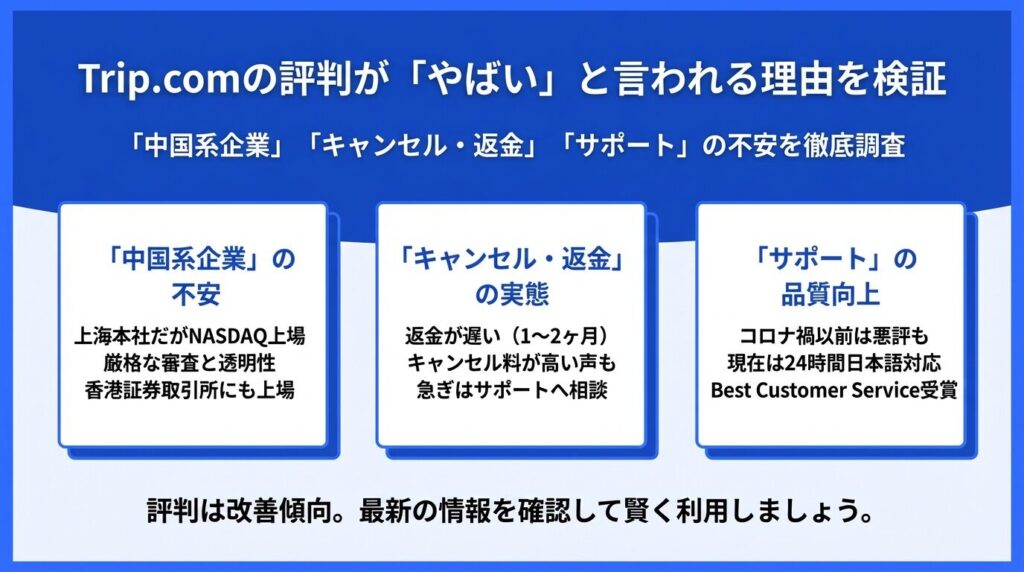 Trip.comの評判を調べると「やばい」「怪しい」という声が出てきます。なぜそう言われるのか、一つずつ検証していきます。