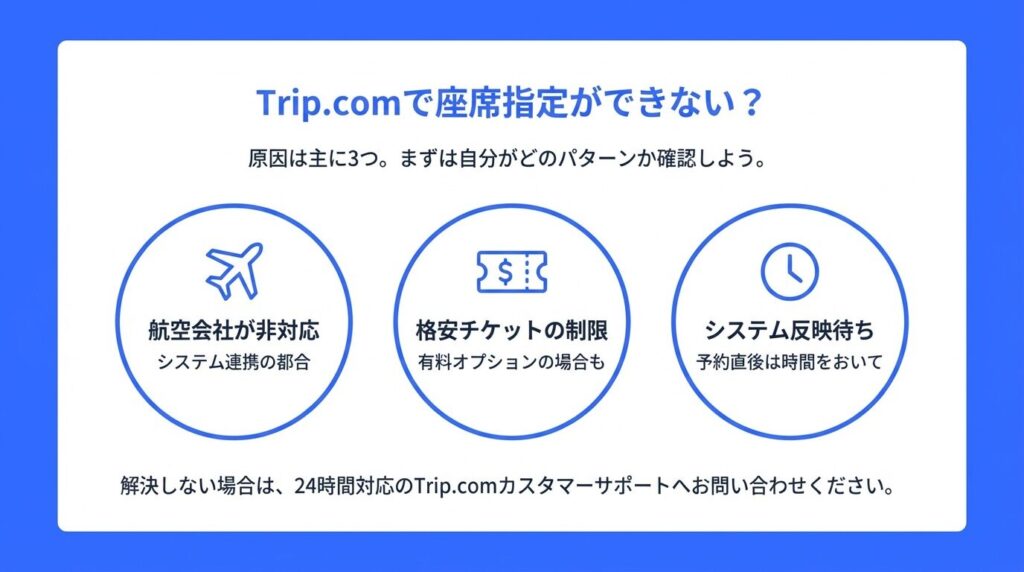 Trip.comで座席指定ができない原因は、主に3つあります。まずは自分がどのパターンに当てはまるか確認してみてください。