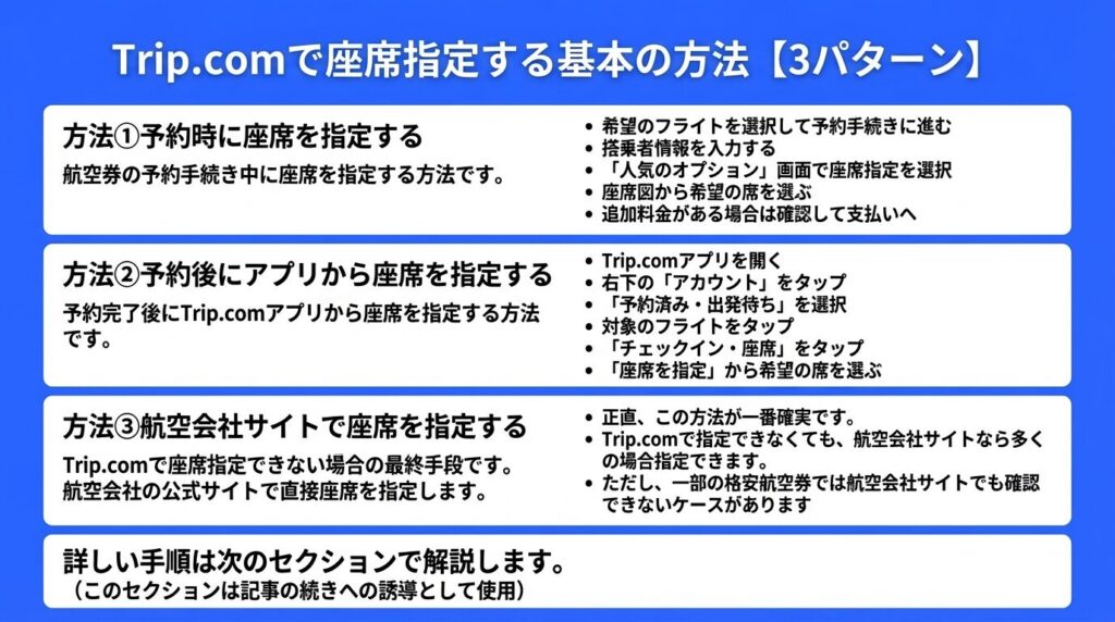 実は、Trip.comでの座席指定には3つの方法があります。Trip.com上で指定できなくても、航空会社の公式サイトを使えばほとんどの場合解決できるので安心してください。